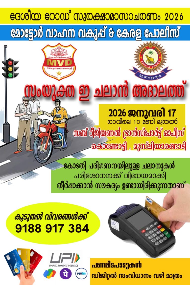 മലപ്പുറം: റോഡ് സുരക്ഷാ മാസത്തോടനുബന്ധിച്ച് പൊതുജനങ്ങൾക്ക് ആശ്വാസമായി കൊണ്ടോട്ടി മോട്ടോർ വാഹന വകുപ്പും പോലീസും സംയുക്തമായി ഇ-ചെലാൻ അദാലത്ത് സംഘടിപ്പിക്കുന്നു. കൊണ്ടോട്ടി മുസ്ലിയാരങ്ങാടി സബ് റീജണൽ ട്രാൻസ്പോർട്ട്...